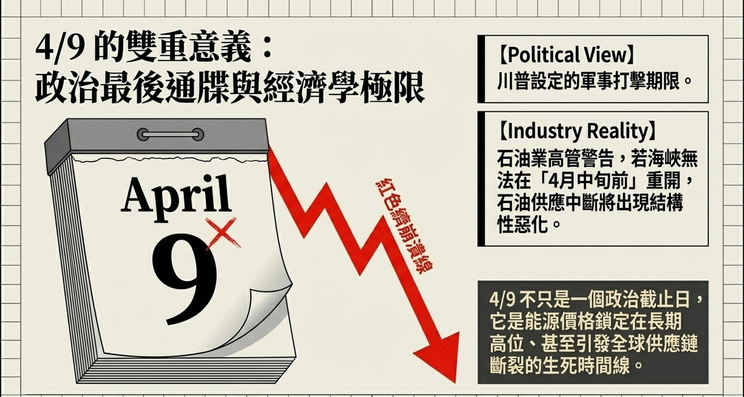 這就是為何「4/9期限」不只是一個政治截止日——它也是一個經濟學上的生死時間線。 其實川普延長10天的期限是落在4月6日,但根據沒法查證的消息報導,川普私下透露了4月9日是最終退場日。我查了一下,選這個日子果然很川普風格,因為2003 年 4 月 9 日就是美軍進入巴格達並推倒薩達姆雕像的歷史時刻!