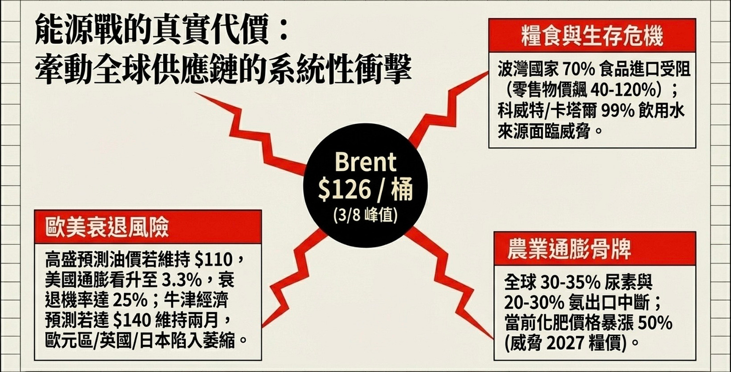 布倫特原油在2026年3月8日突破每桶100美元,為四年來首次,並一度攀升至每桶126美元的峰值。這場危機被描述為自1970年代石油危機以來最嚴峻的能源供應衝擊,也是全球石油市場有史以來規模最大的供應中斷事件。