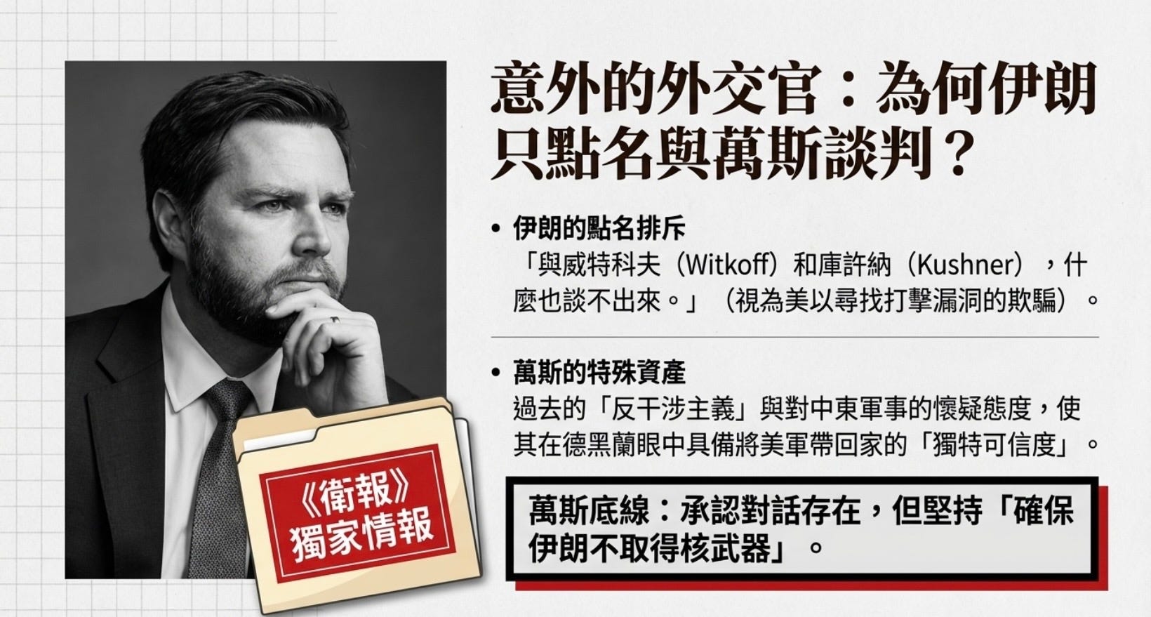 • 轉變原因: 有報導稱,伊朗方面對威特科夫和庫許納先前的談判方式感到不滿,認為其猶太人身份缺乏中立性或存在欺騙,因此萬斯的加入被視為打破僵局的嘗試。