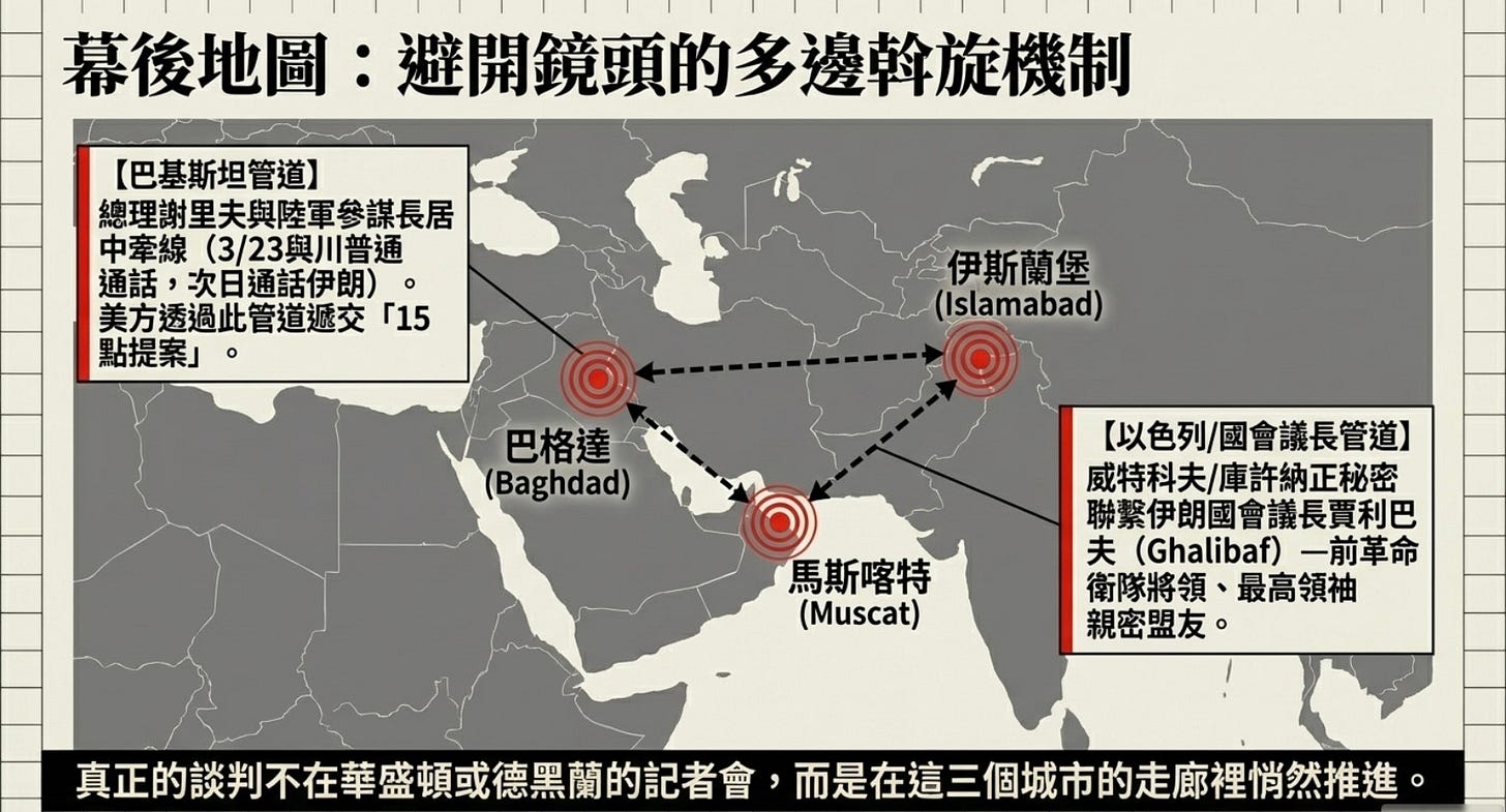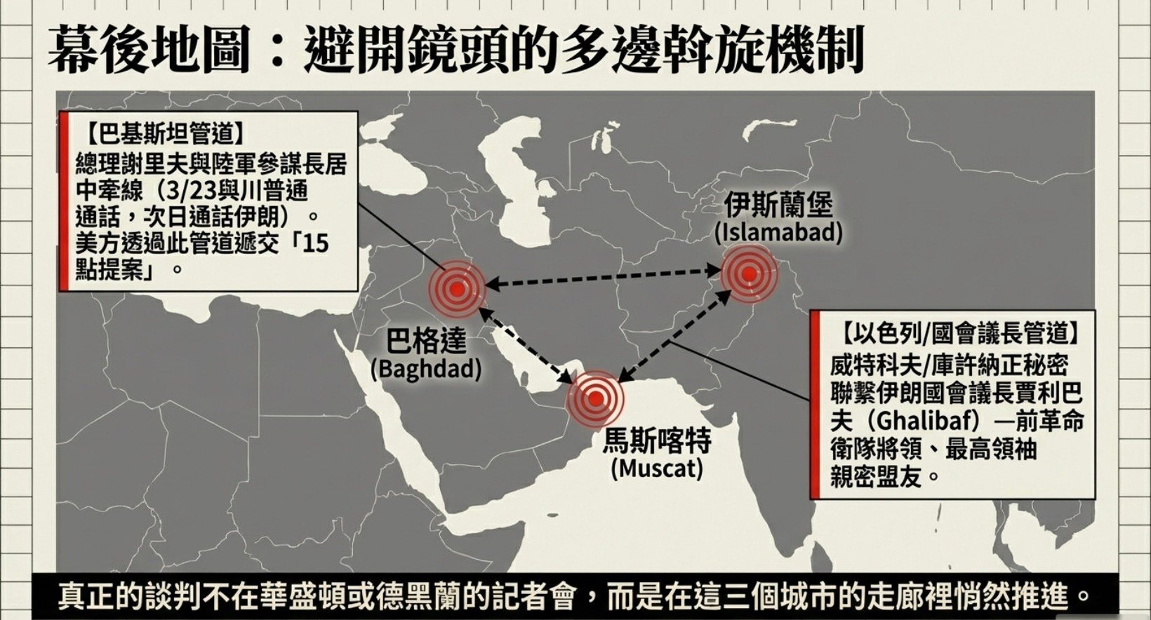 這一幕後外交地圖揭示了一個現實:真正的談判並非在鏡頭前進行,而是在伊斯蘭堡、馬斯喀特與巴格達的走廊裡悄然推進。