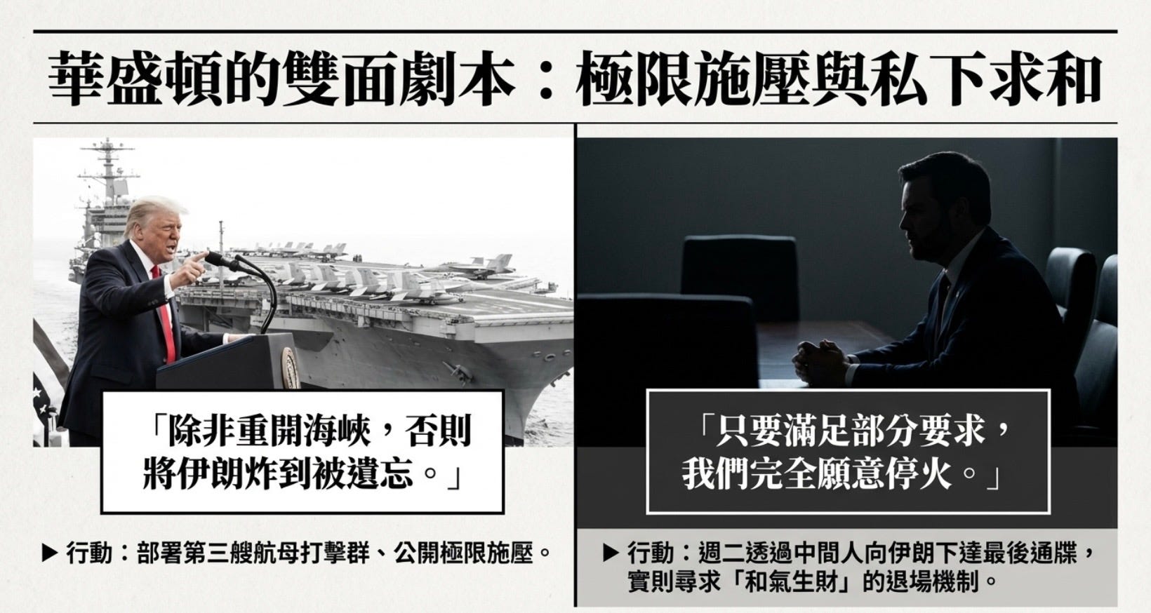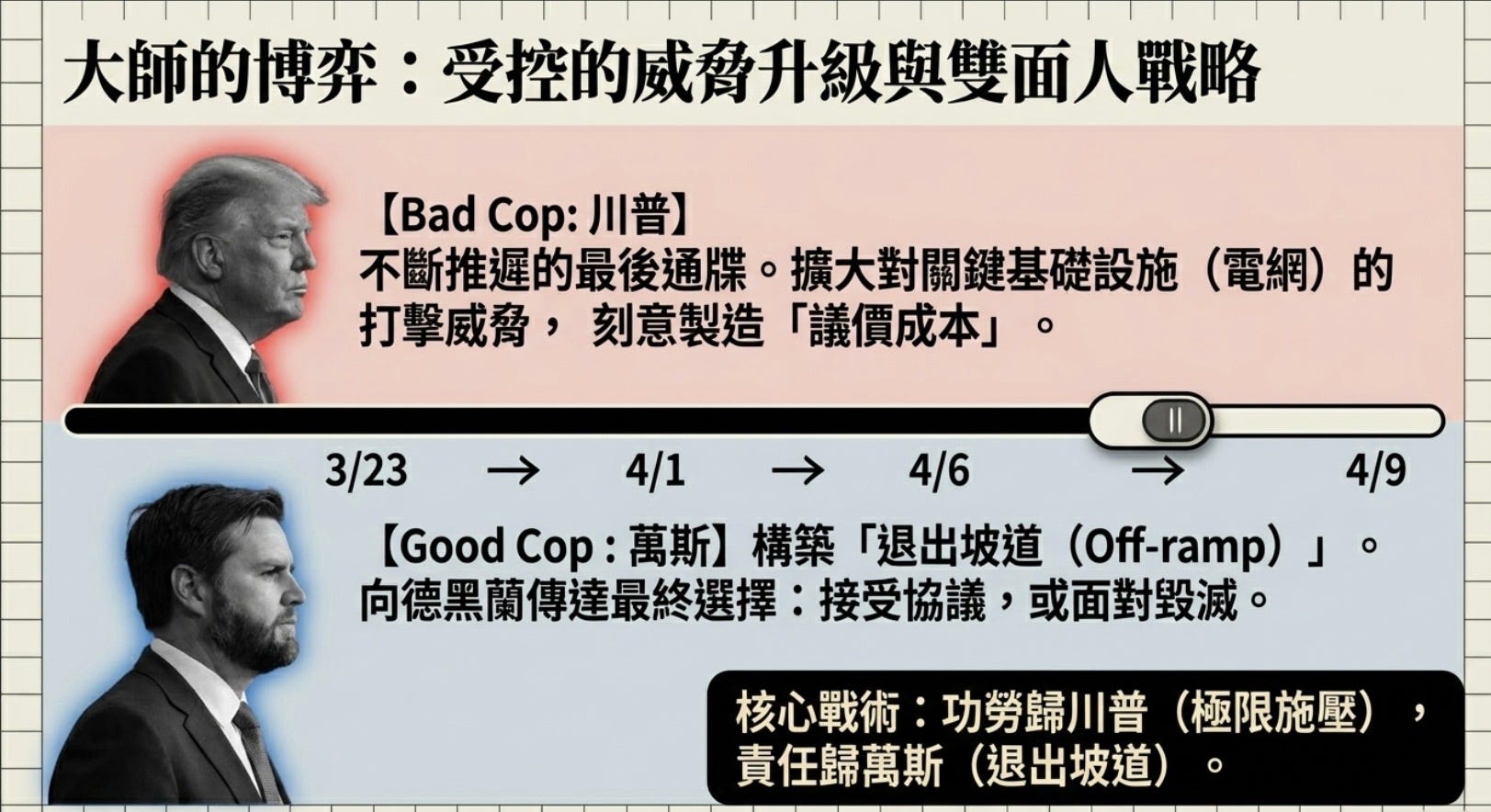 川普的政治手腕在這場危機中展露無遺,以「好警察/壞警察」的精密分工,表面上是威脅,本質上是在談判破裂前的最後「議價」。根據 Bloomberg報導,川普正在為結束伊朗戰爭構建「退場台階」,派遣萬斯向德黑蘭傳達最後通牒:要麼達成協議,要麼面對關鍵基礎設施的攻擊,打回石器時代。