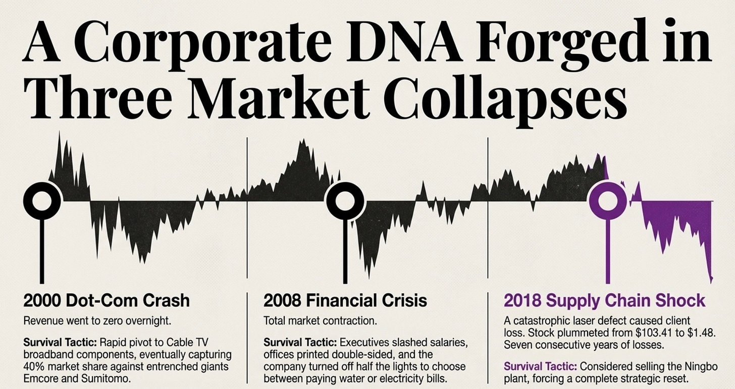• 第一劫(2000-2003): 網路泡沫讓光通訊產業瞬間歸零。林誌祥在同業紛紛倒閉時,堅持投入昂貴的「雷射晶片自研」,這在當時被視為「燒錢的自殺行為」,卻讓 AOI 成為全球少數掌握核心晶片源頭的公司。