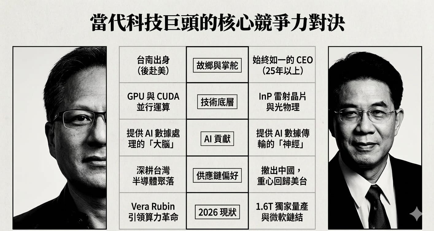 終身投入技術的「學霸」: 他們都不是單純的商人,而是深厚的科學家與工程師。黃仁勳對並行運算的痴迷延續了 30 年;林誌祥則是密蘇里大學電機工程博士,終身研究半導體雷射與光學物理。對於核心技術(晶片設計與雷射物理)的極致追求,是他們企業的靈魂。