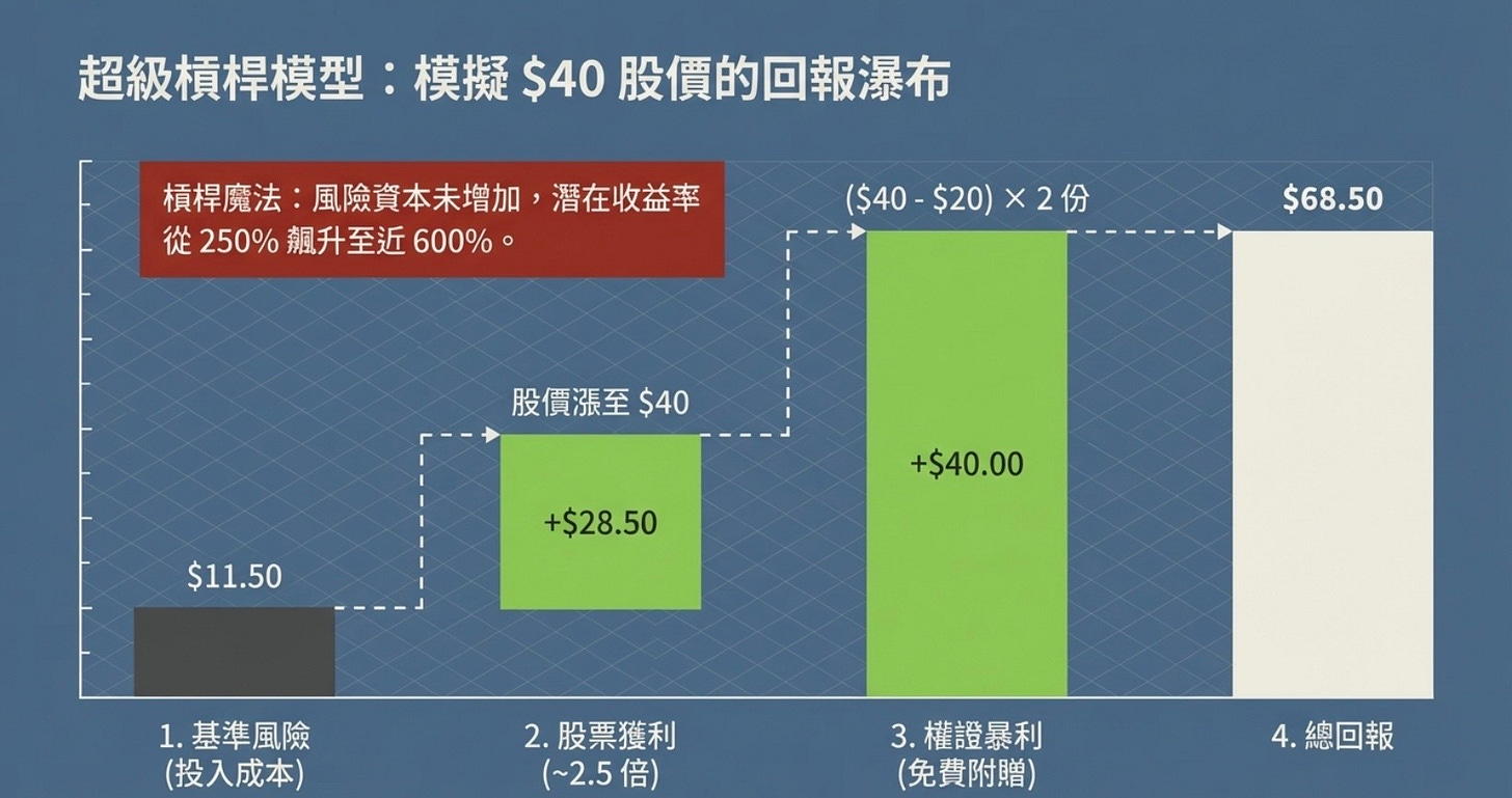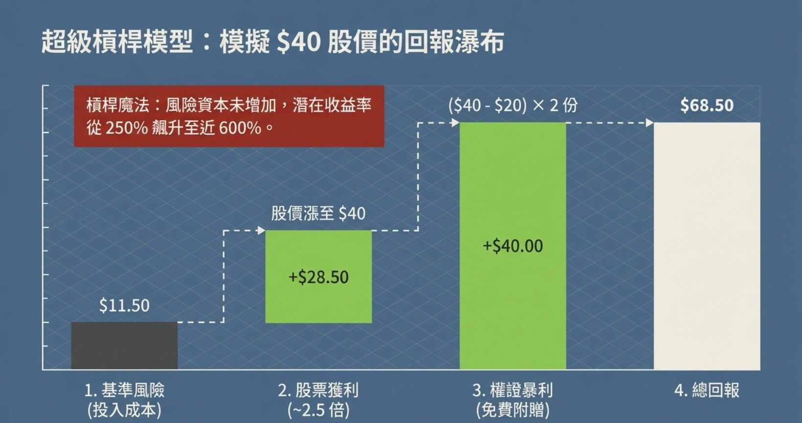 看到這裡,你的想法可能是:畢竟機構也是真金白銀在$11.5 及$16.45 認購的,那些價外極高溢價的免費權證並不重要。我目前在現價$10 以下進場很不錯啦,比機構入股時機更佳!單純地看是沒錯的,現在讓我們到看清楚,機構為什麼願意溢價買入,用了什麼華爾街「煉金術」,永遠處於不敗之地!