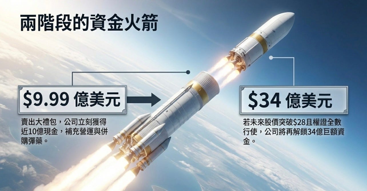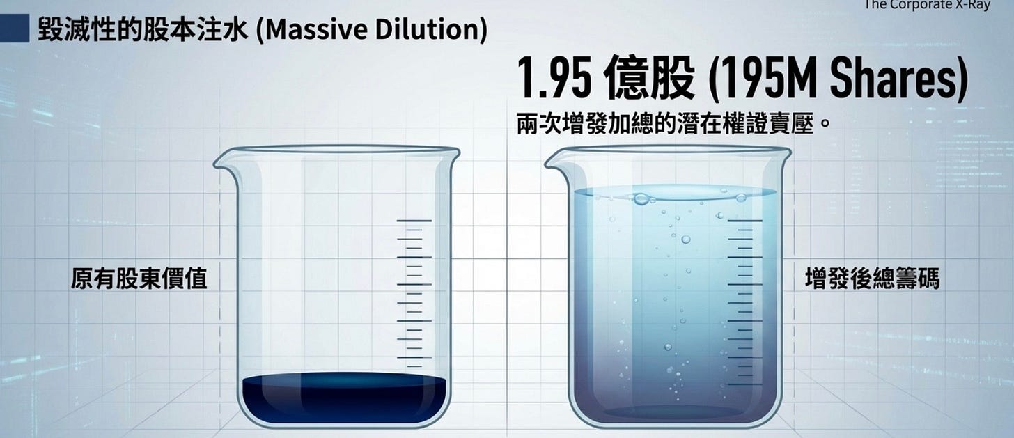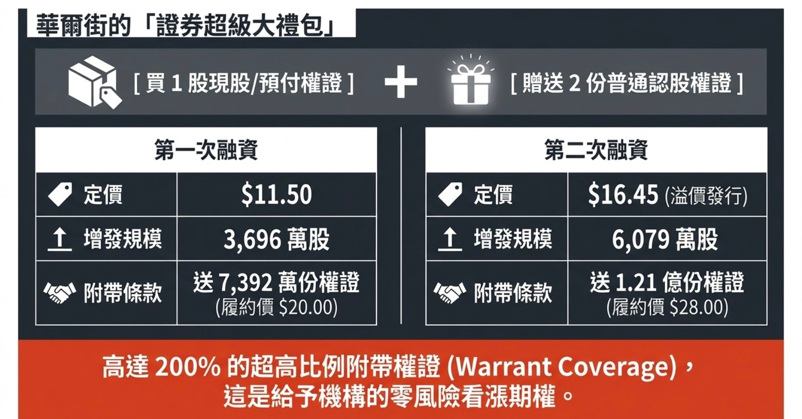 兩次融資加總:當下抽走約 14.2 億美元現金,製造高達 1.95 億份的潛在權證賣壓!