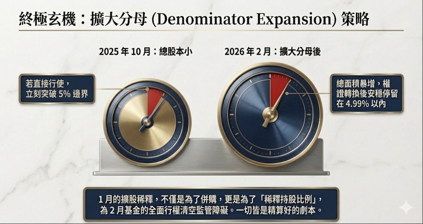 • 為什麼在 2 月行使? 當總股本擴大後,原本基金手裡的預付權證所佔的比例就「被稀釋」了。這給了基金一個新的額度,讓他們可以在不觸碰 5% 紅線的前提下,將手裡的權證轉為普通股。