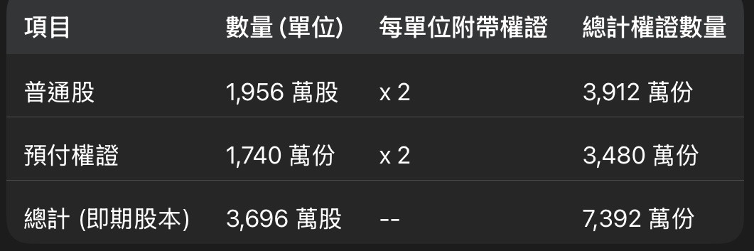 • 普通股附帶部分: 1,956 萬股 × 2 = 3,912 萬份權證。