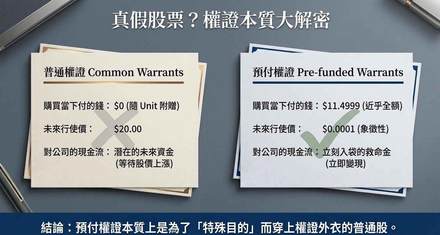 現在我們要談到整個操作中最精妙、也最陰暗的設計:Pre-Funded Warrants(預付認股權證)。你注意到了嗎?第二次融資裡,普通股只有 1,900 萬股,但預付認股權證卻高達 4,179 萬份,比例超過整體發行量的三分之二。