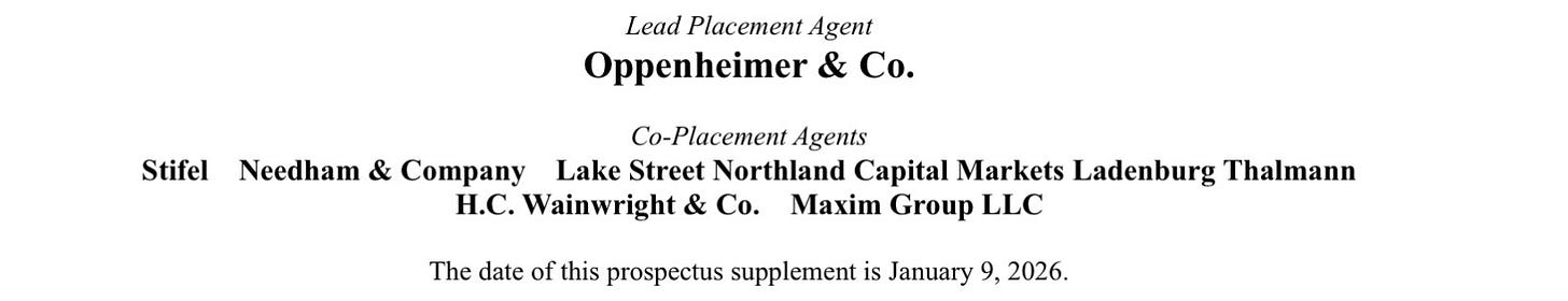 第二次融資中,預付權證(Pre-Funded Warrants) 的壓倒性比例,清晰地告訴我們:這次融資,是被少數幾家超級機構幾乎全包了。這不是公開市場上的散戶認購,這是一場閉門的私人盛宴,散戶只能從新聞稿裡得知它的存在。
