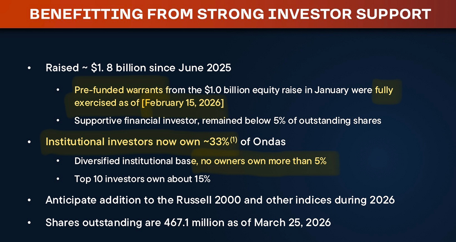 • 1 月融資的關鍵作用: 2026 年 1 月,Ondas 發行了大量新股(約 1,900 萬股普通股加上 4,100 多萬份預付權證)。這使得公司的 「總發行股數 (Shares Outstanding)」 瞬間暴增。